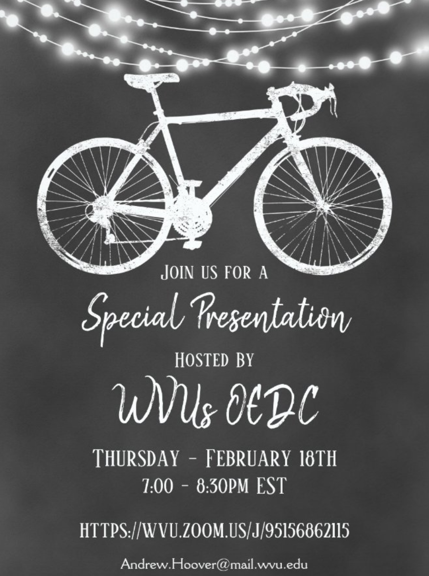 ________________________________ From: Andrew Hoover Sent: Sunday, February 14, 2021 12:09 PM To: Andrew Hoover Andrew.Hoover@mail.wvu.edu Cc: Gregory Corio Greg.Corio@mail.wvu.edu; Kat Andrus kat@peopleforbikes.org; Danny Twilley danny.twilley@mail.wvu.edu Subject: Morgantown Cycling Meeting : Thursday (2/18) : 7:00PM-8:30PM est