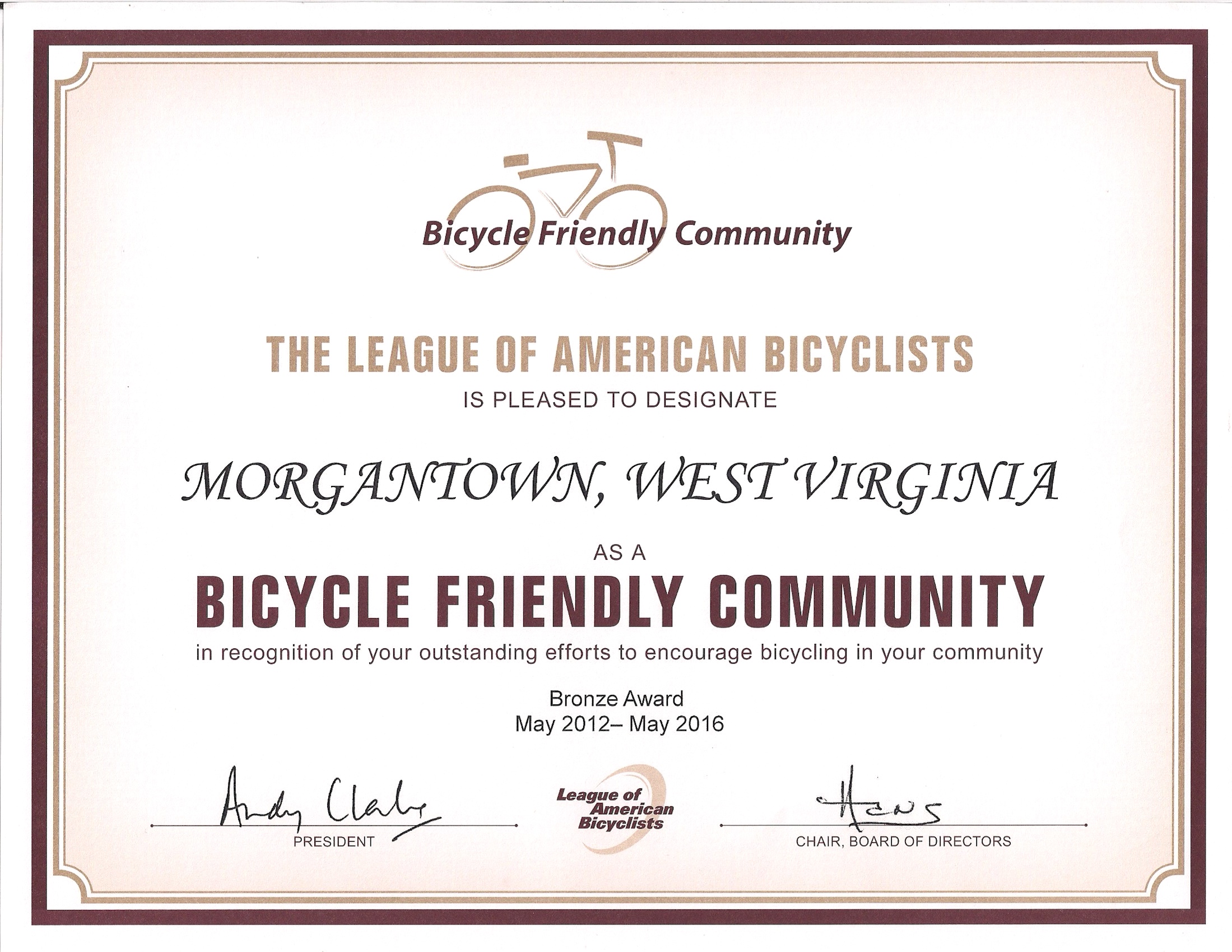 ----- Original Message ----- From: "Frank Gmeindl" fgmeindl@gmail.com To: "Jim Manilla" jimmanilla@gmail.com, "Terrence Moore" tmoore@cityofmorgantown.org Cc: "Bike Board - Morgantown" bikeboard@cheat.org, "Roy Nutter" Roy.Nutter@mail.wvu.edu Sent: Monday, May 14, 2012 3:15:13 PM Subject: Bicycle Friendly Award Certificate