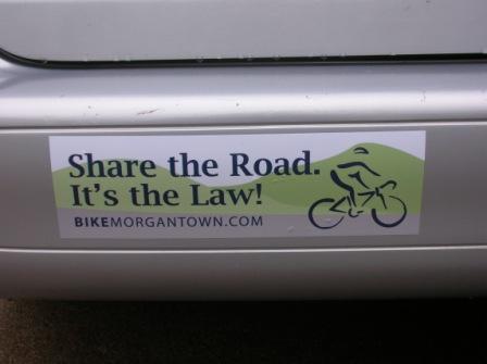 I am on a committee to implement the "Morgantown Effective Bicycling Education Program" grant. If you are willing to place the sticker (pictured below) that we developed on your auto bumper, email me and I will put one in your mailbox next week.