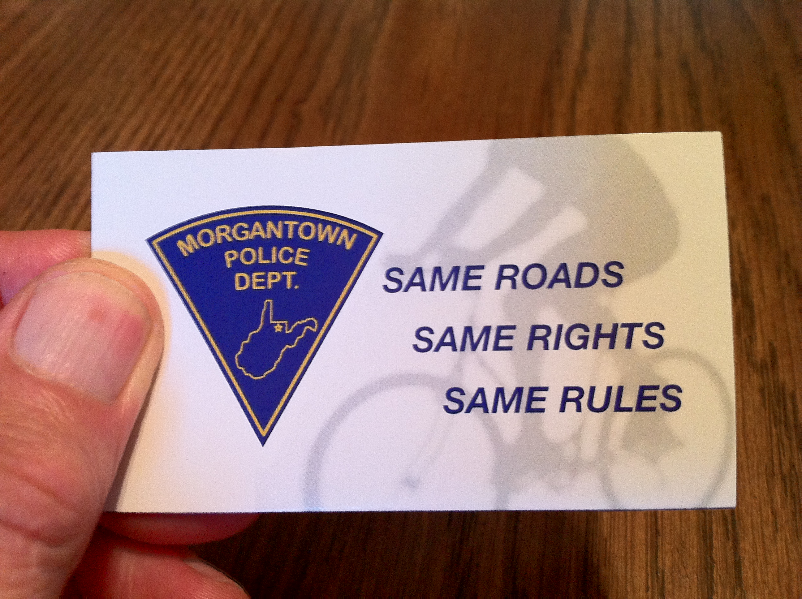 At last night's Traffic Commission meeting, First Sargent McCabe reported that Morgantown Police are not distributing the bicycle safety cards (see attached) but are rather issuing warnings and citations. As I mentioned last night, the Bicycle Board discourages sidewalk bicycling but recognizes that most bicyclists as well as motorists do not recognize that bicyclists have the same rights to the road as motorists and are subject to the same duties. The Bicycle Board would like the police to encourage bicyclists to ride on the road and provide them information with which they can learn how to do so legally and safely.
