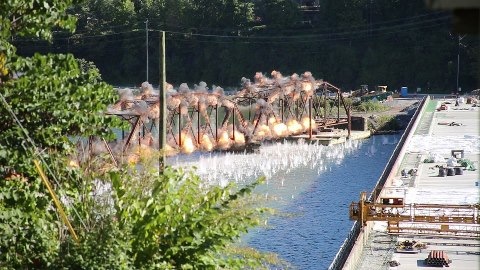 The new bridge deck is on the right, scheduled to open the first part of November 2012. The Cheat Lake dam construction was started in 1912, some one hundred years ago, finished in 1926. The old bridge shown here was built not that long thereafter, around 1936.