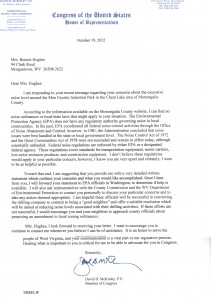 On October 19, 2012, WV Congressman David McKinley responded to Bonnie's complaint regarding the excessive noise level at the MFIP. He explains, "TheNoise Control Act of 1972 http://www.epa.gov/air/noise/noise_control_act_of_1972.pdfandQuiet Communities Act of 1978 http://www.epa.gov/air/noise.htmlwere not rescinded, and remain in effect today." However, McKinley says, "In 1981, the Administration concluded that noise issues were best handled at the state or local governmental level." McKinley copied this information in his letter verbatim from EPA's website http://www.epa.gov/aboutepa/history/topics/noise/index.html. Neither does he believe that current Federal regulations enforced by the EPA or a designated agency would apply to her complaint. Then he offers to forward a very detailed written statement of her concerns to the EPA to determine if help is available, and ask the County Commission, and WV DEP to contact her personally. Bonnie sent this statement to McKinley on October 22, 2012, and has not heard back. But, the residents have already been through this circuit with the EPA, DEP and County Commission over and over again. He says, "I am hopeful these officials will be successful in convincing the drilling company to commit to being a "good neighbor" and offer a suitable resolution which will be aimed at reducing the noise levels associated with their drilling activities."