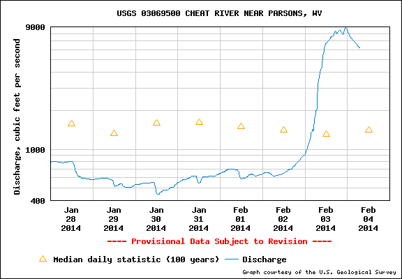 See the Cheat River flow at Parsons in Tucker County. There is lots more water to come as we get rain and melting snow today!