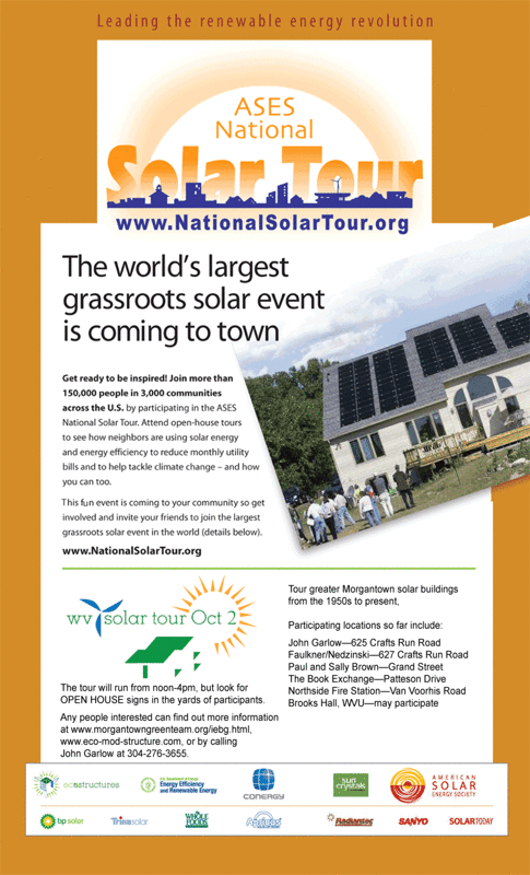 Saturday, October 2, 2010, will be Morgantown’s second participation in the national solar tour. Any people interested can find out more information at www.morgantowngreenteam.org/iebg.html,http://www.morgantowngreenteam.org/iebg.html, www.eco-mod-structure.comhttp://www.eco-mod-structure.com/, or by calling John Garlow at 304-276-3655. Most locations will be open from noon until 4 pm, but look for yard signs that say OPEN HOUSE for the Solar Tour.