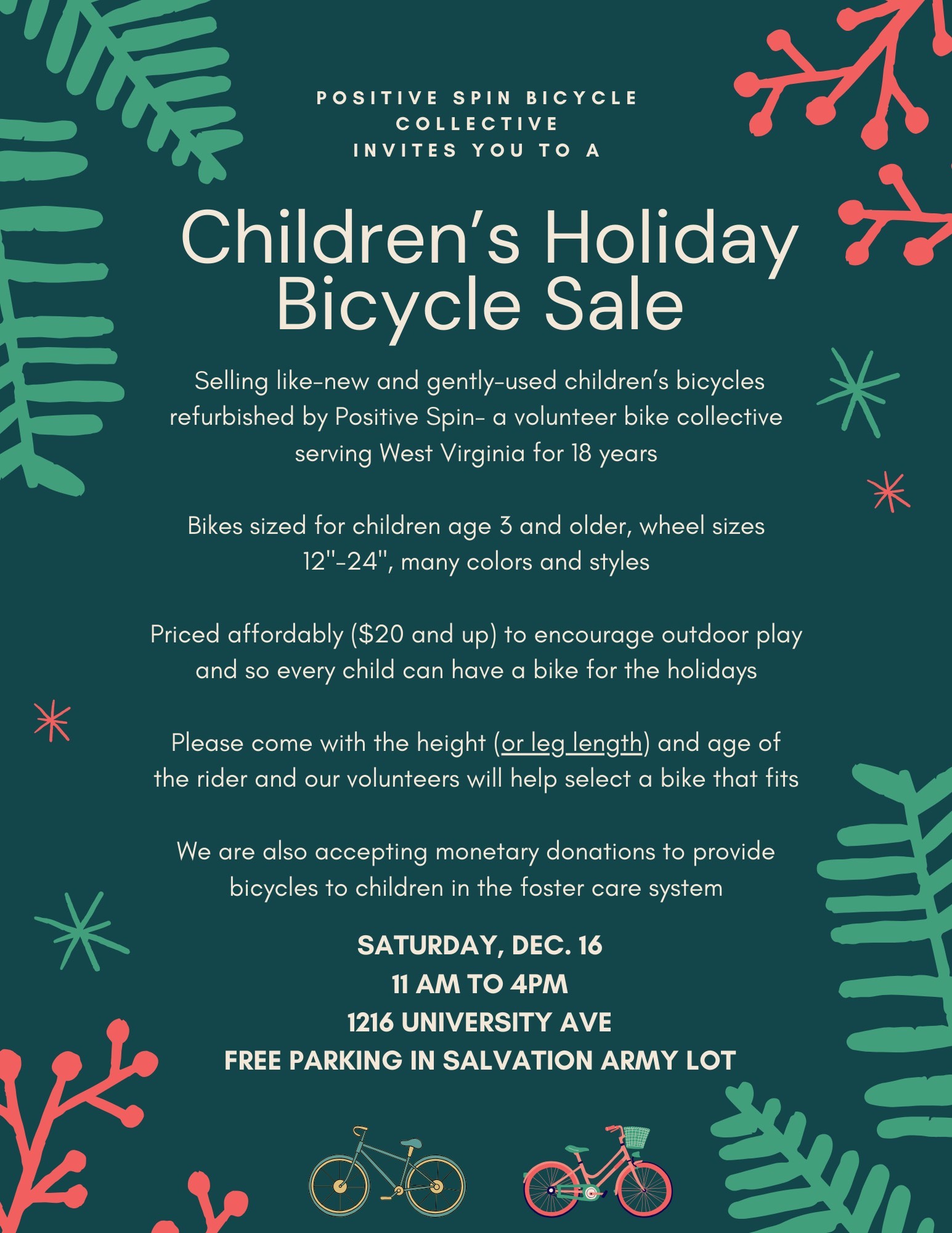 We invite you to a children's holiday Bike Sale this *Saturday, 11-4pm *at our shop at 1216 University Ave. in Morgantown!